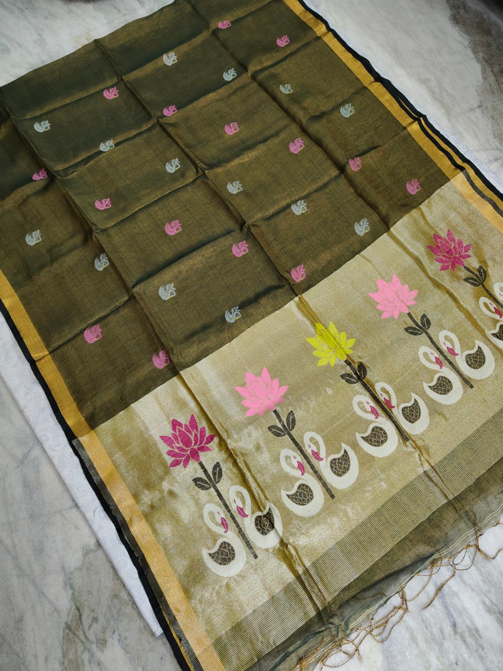 Tissue Lenin Handwoven Jamdani Saree with Paithani Swan Pallu (TLPJ09)