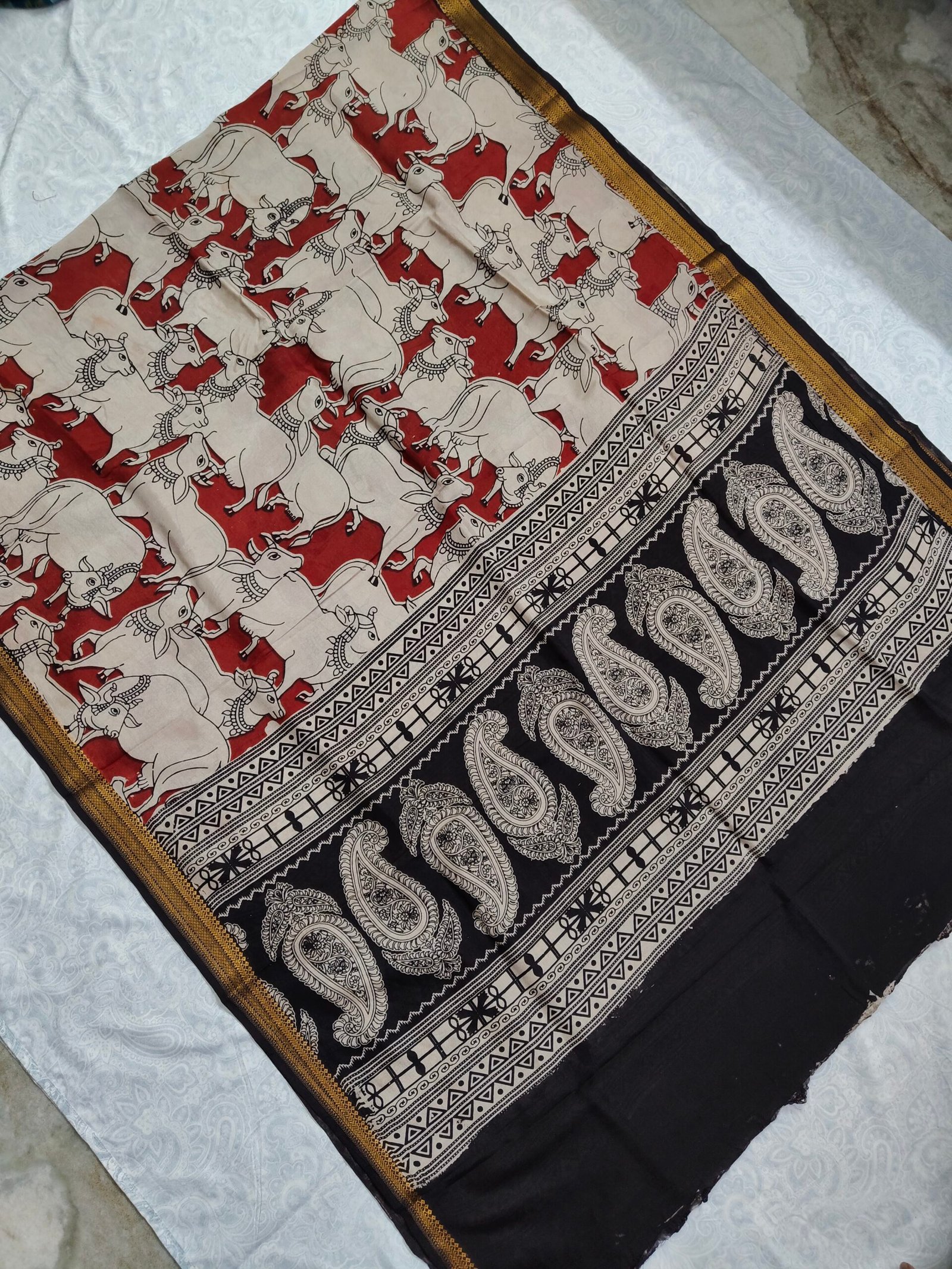 - Kalamkari Chennuru Silk Dupatta with an elegant Nizam border, crafted using hand block or screen block printing with natural dyes.