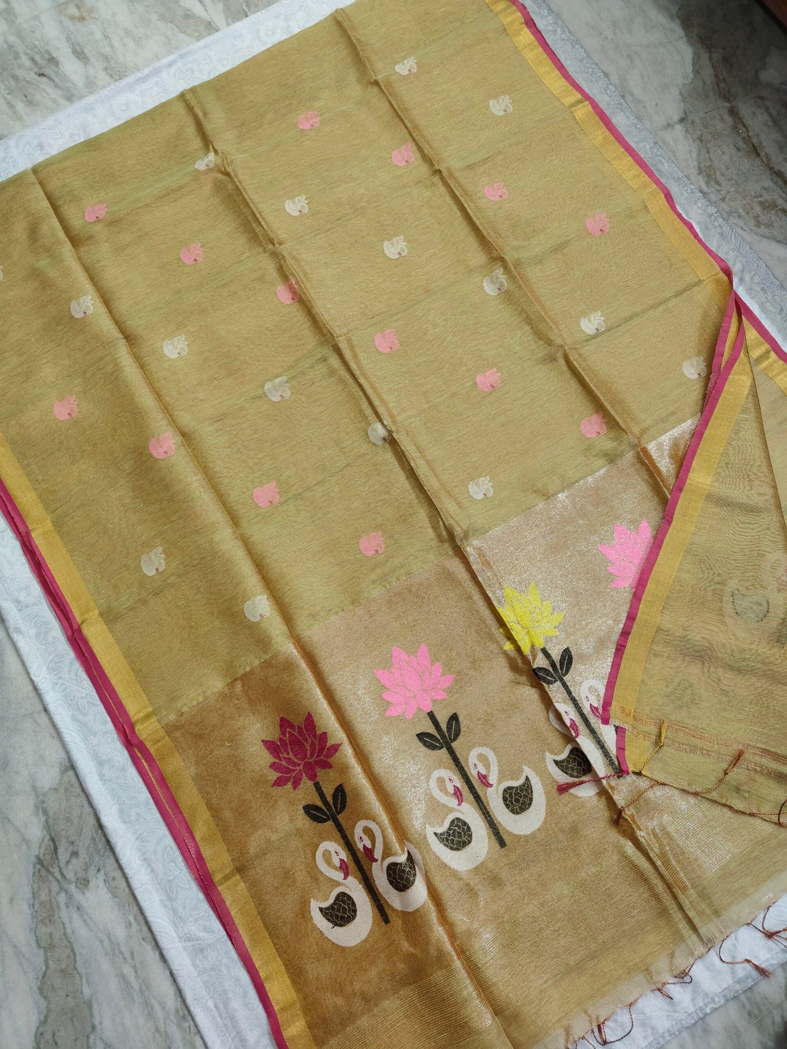 - Tissue Lenin Jamdani Saree with an Handwoven Paithani Pallu .