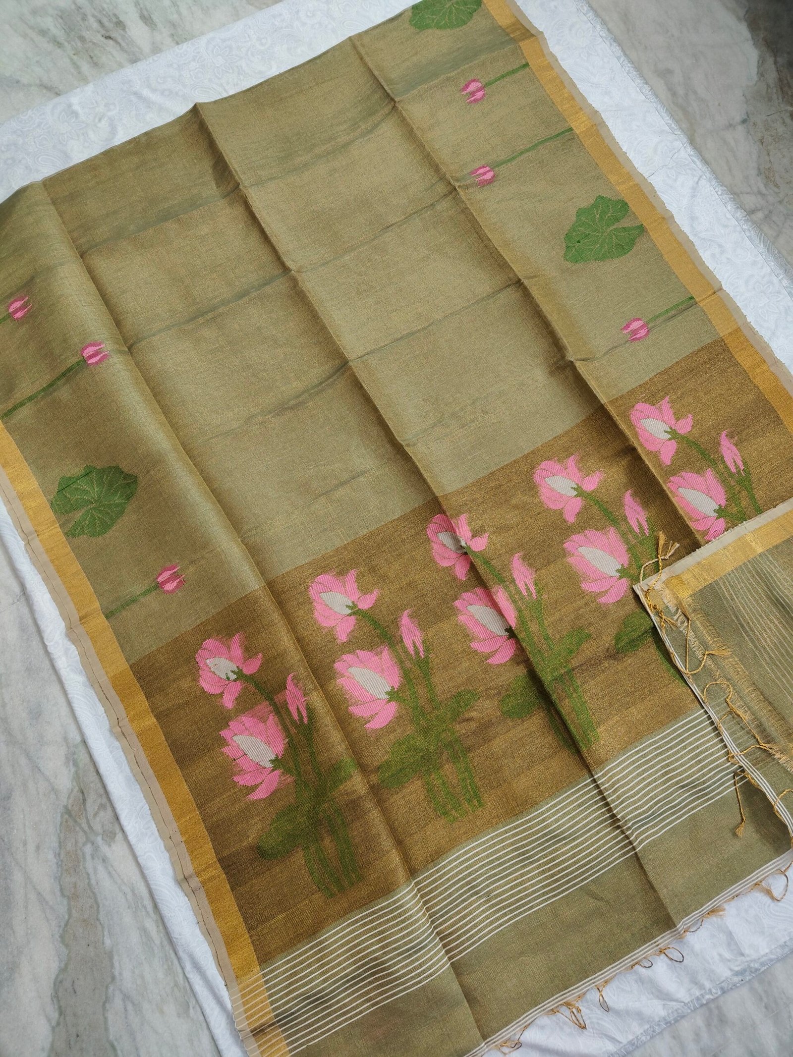- Tissue Lenin Jamdani Saree with an Handwoven Paithani Pallu .
