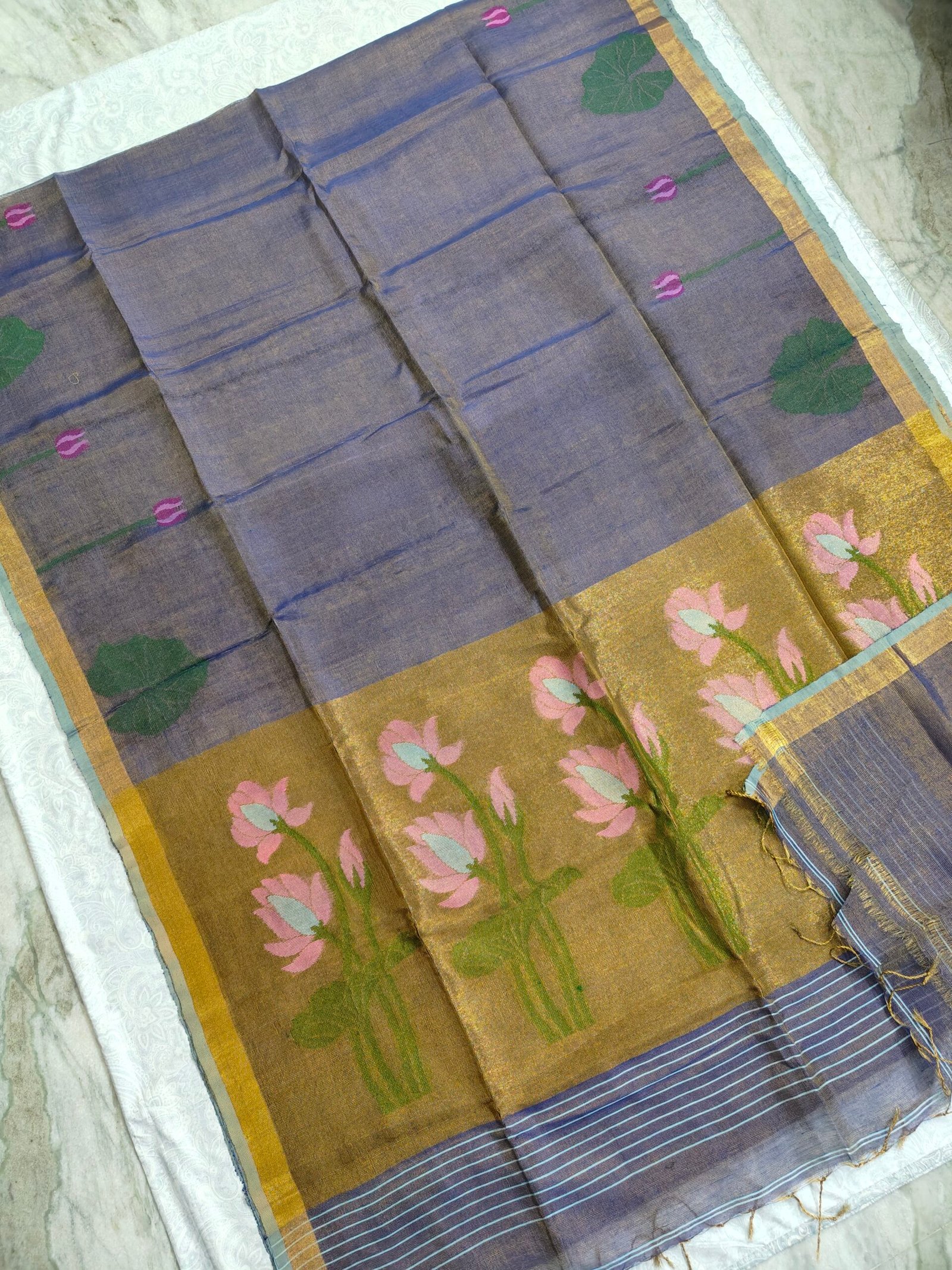 - Tissue Lenin Jamdani Saree with an Handwoven Paithani Pallu .
