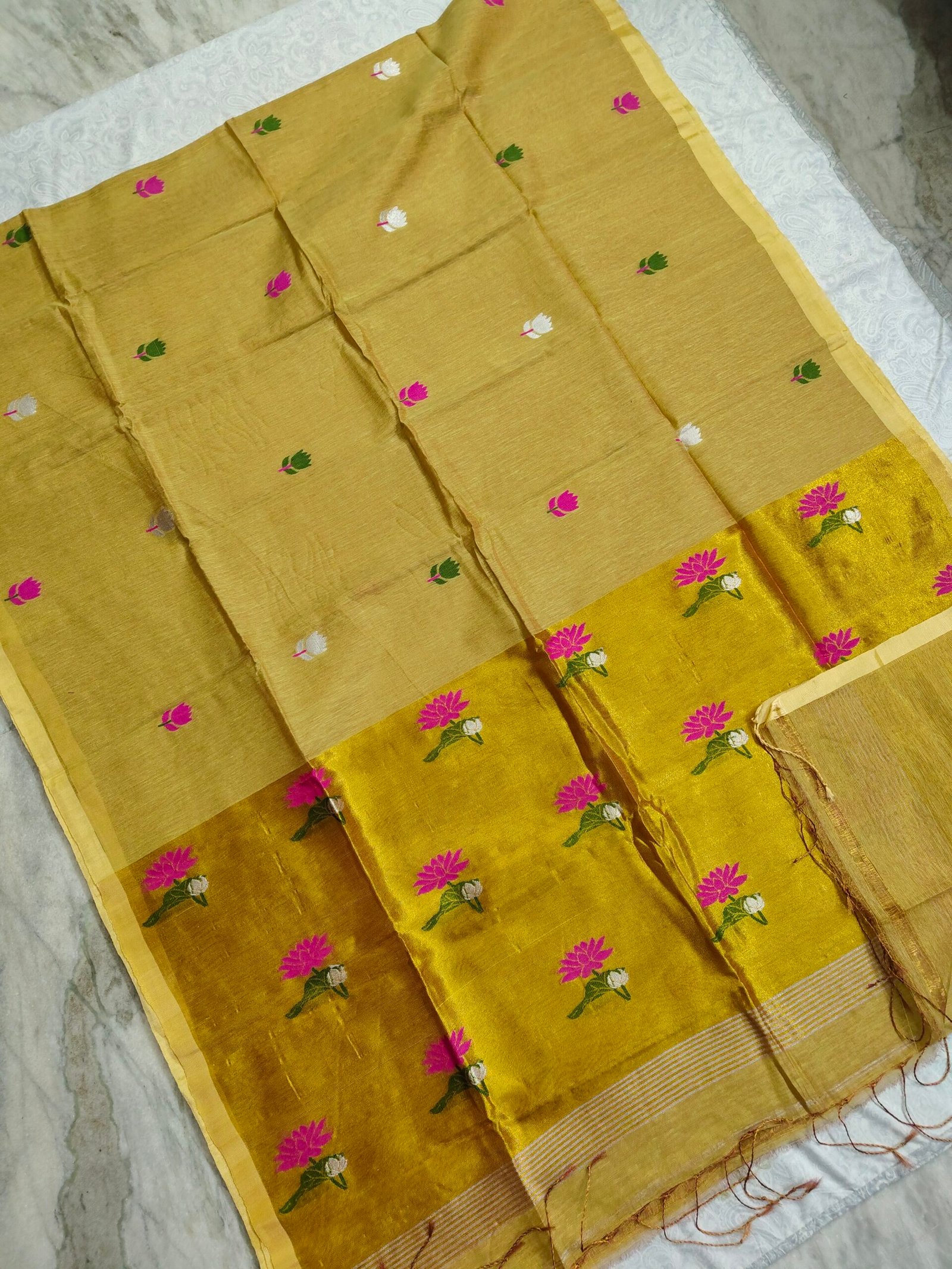 - Tissue Lenin Jamdani Saree with an Handwoven Paithani Pallu .